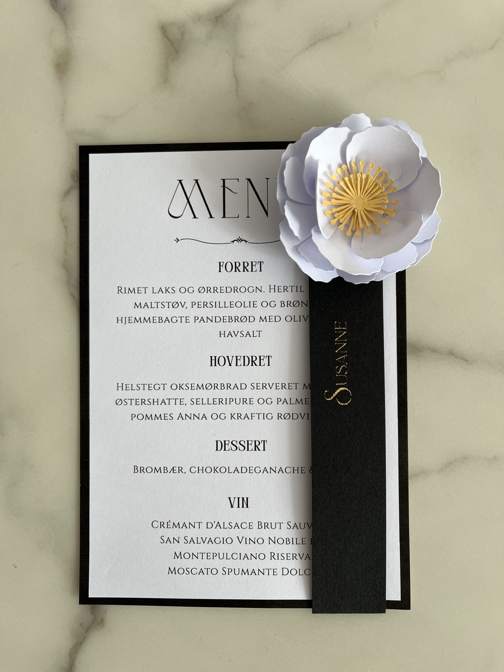 Bordkortet er designet til at blive sat rundt om menuen og skaber en personlig, luksuriøs og gennemført helhed ved hver kuvert.