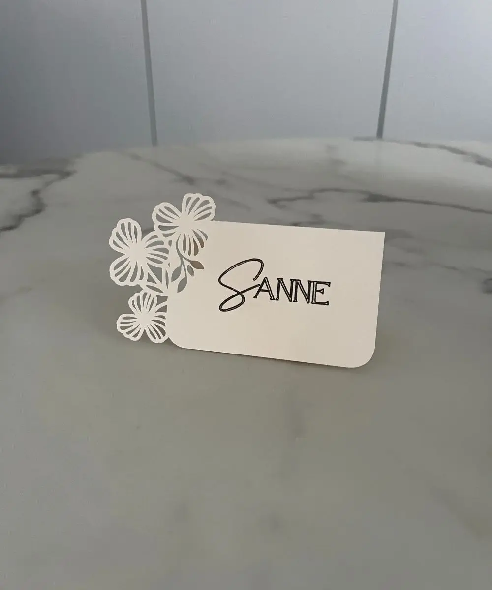 Dette elegante bordkort er skabt til dig, der ønsker et smukt og personligt udtryk ved borddækningen. Kortet er lavet i en blød, cremefarvet karton og dekoreret med fine udskårne blomster, som giver et let og romantisk løft til enhver festlig anledning.