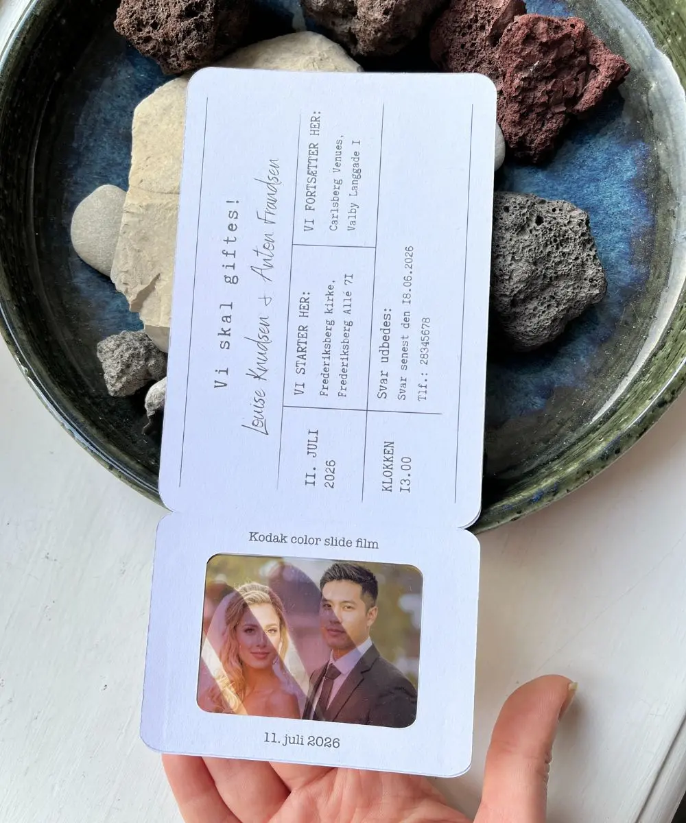 Denne bryllupsinvitation er inspireret af klassiske Kodak Polaroid-billeder og vintage dias. Et personligt foto kombineres med et minimalistisk sort-hvidt design, der giver invitationen et ærligt og tidløst udtryk.