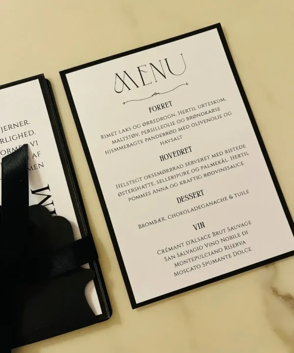 Skab et gennemført og stilrent udtryk ved bordene med vores Classic Noir Menu, designet til at matche Classic Noir invitationerne og binde hele temaet elegant sammen. Den sort/hvide farve palette giver et eksklusivt og sofistikeret look, mens detaljerne bevarer det klassiske noir-udtryk, der kendetegner serien.