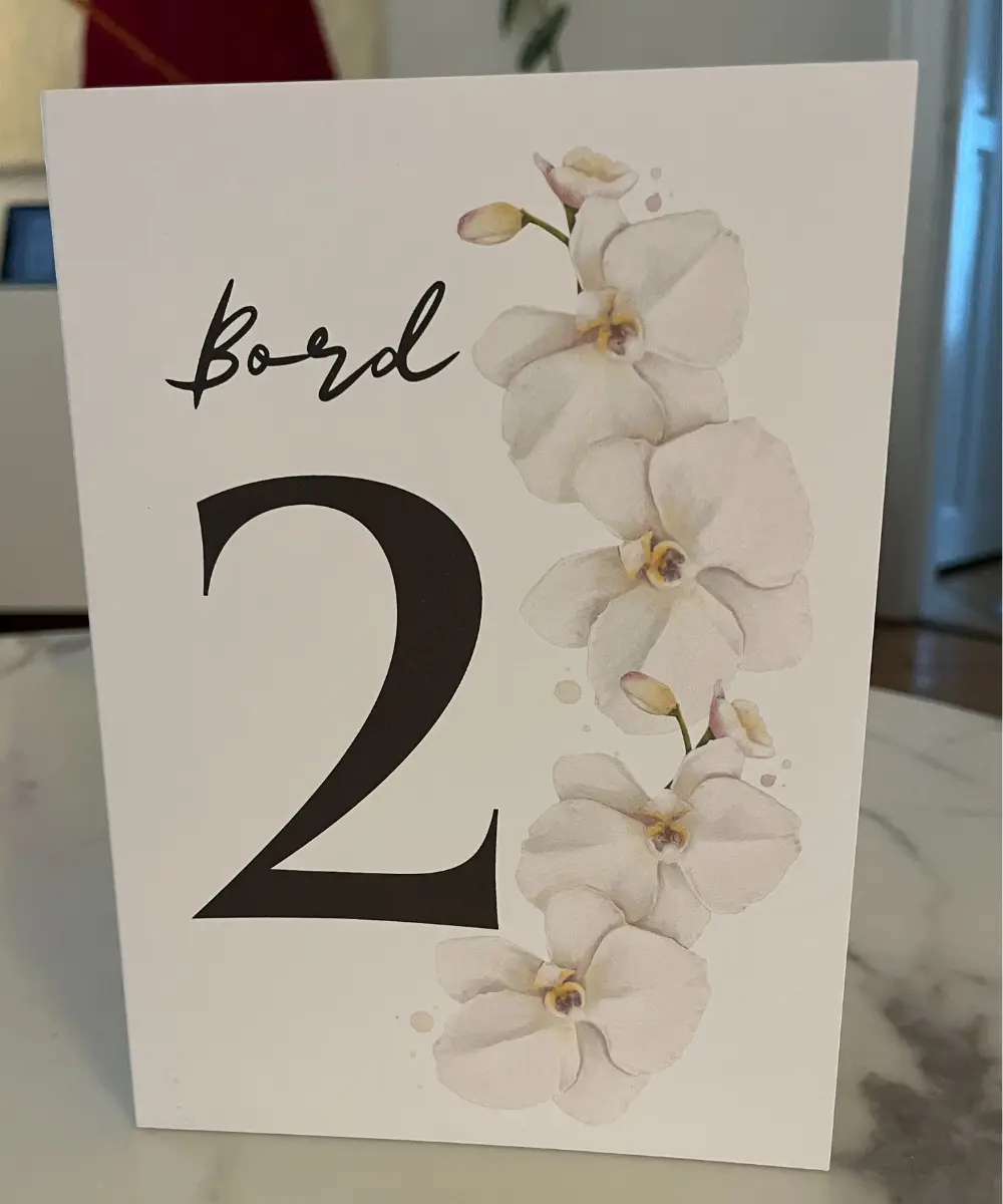 Skab et smukt og harmonisk udtryk på dine festborde med dette elegante bordnummer dekoreret med delikate hvide orkidéblomster. Designet kombinerer et moderne, stilrent layout med botaniske detaljer, der løfter borddækningen og gør det let for gæsterne at finde deres pladser.