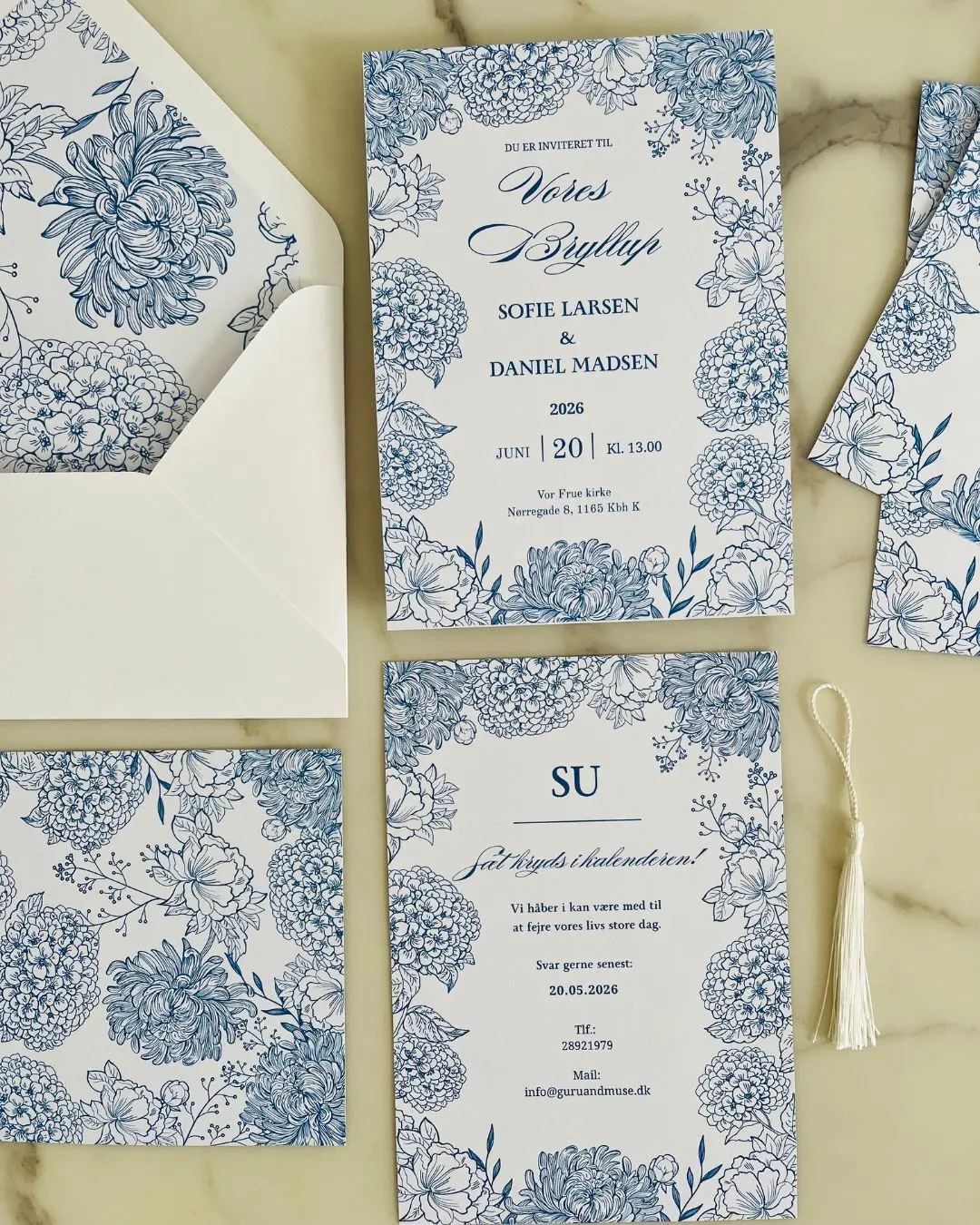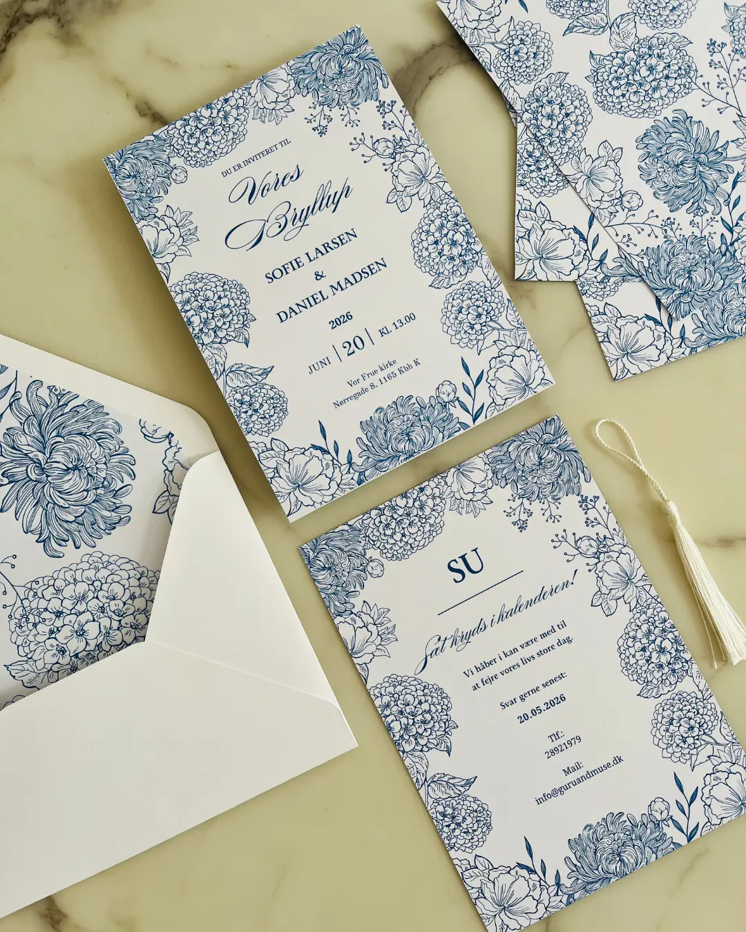 Skabt med kærlighed og elegance, er denne invitation pyntet med delikate blå blomster på en rolig hvid baggrund. Det romantiske design udstråler ro, trofasthed og evig kærlighed – perfekt til par, der ønsker et tidløst og poetisk udtryk til deres store dag. En personlig detalje til et uforglemmeligt “ja”.