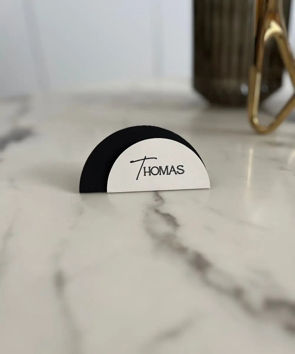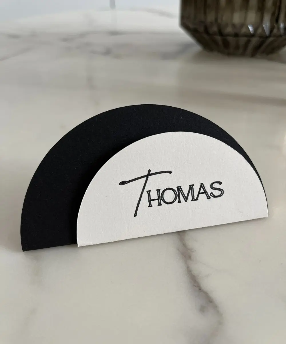 Dette moderne halvmåneformede bordkort skaber et stilrent og roligt udtryk ved borddækningen. Kombinationen af det grafiske snit og den bløde runding giver et eksklusivt look, der passer perfekt til bryllupper, konfirmationer, fødselsdage og andre fejringer, hvor detaljen gerne må være gennemført.