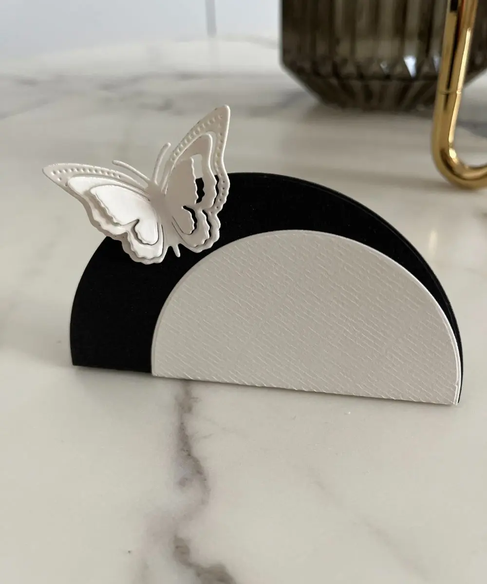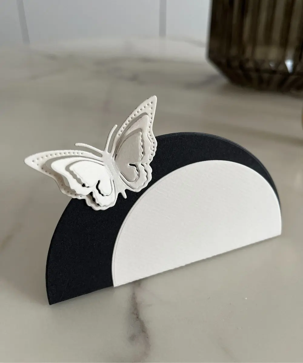 Som ekstra finesse kan du tilføje en 3D-sommerfugl, der giver bordkortet et let, poetisk og svævende element – perfekt, når du ønsker lidt mere romantik og liv i opdækningen.