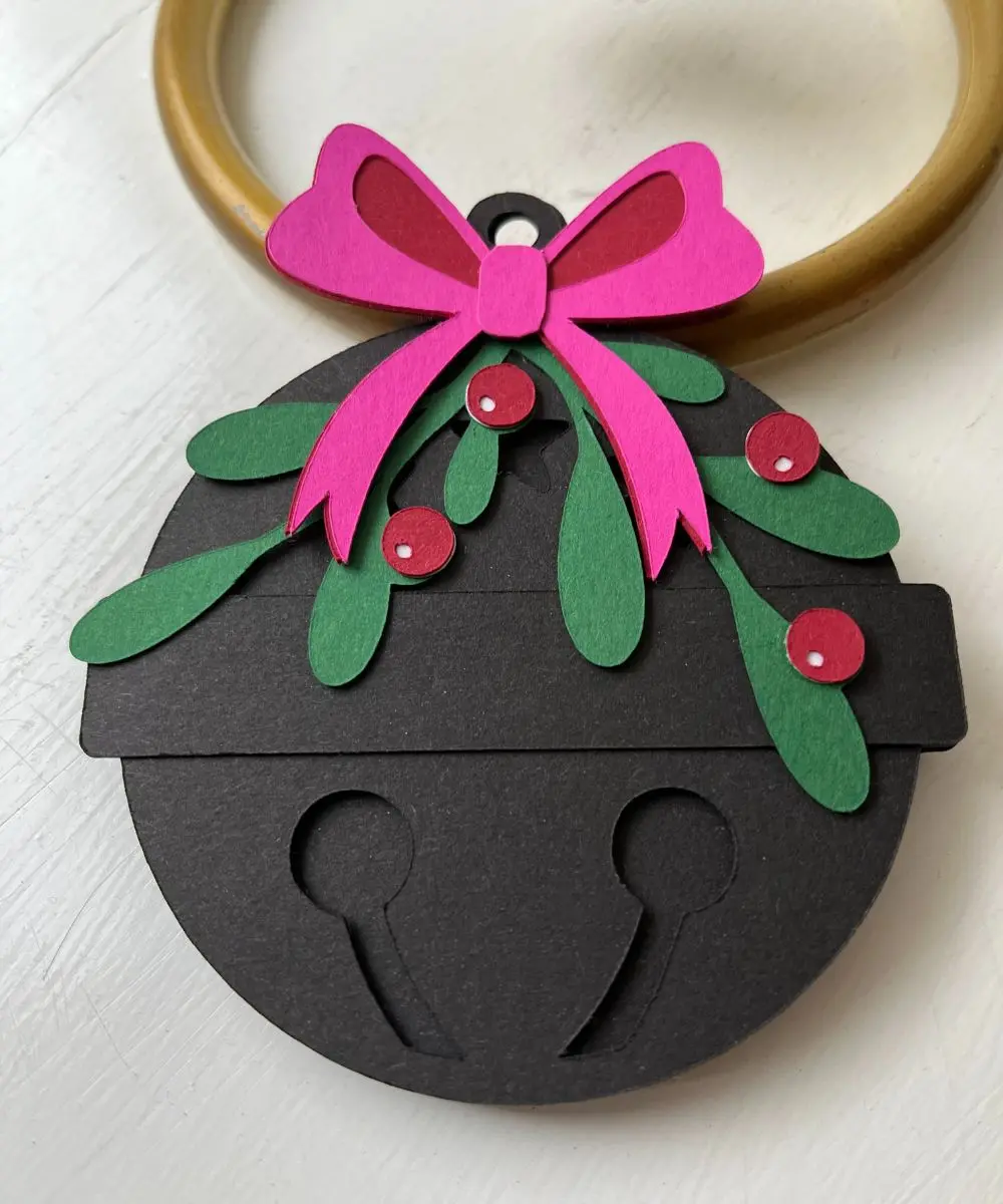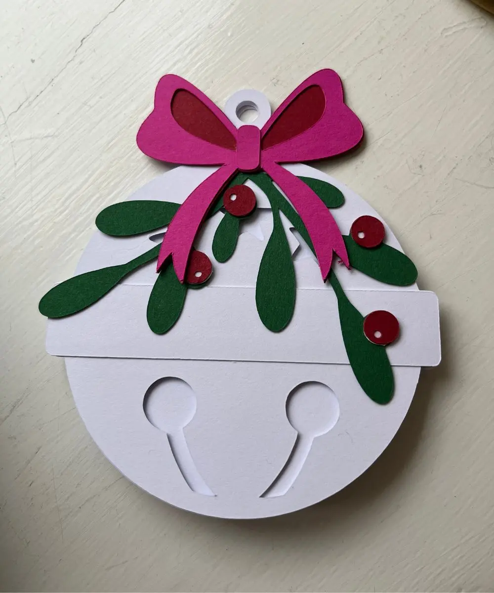 Dette jule til og fra kort er udformet som en julekugle med udskårne detaljer, farvet bånd og dekorative elementer i 250 g. karton. Kortet har plads til at skrive både navn og hilsen og kan bruges til gaver under juletræet, adventspakker eller som ekstra pynt på en gavepose.