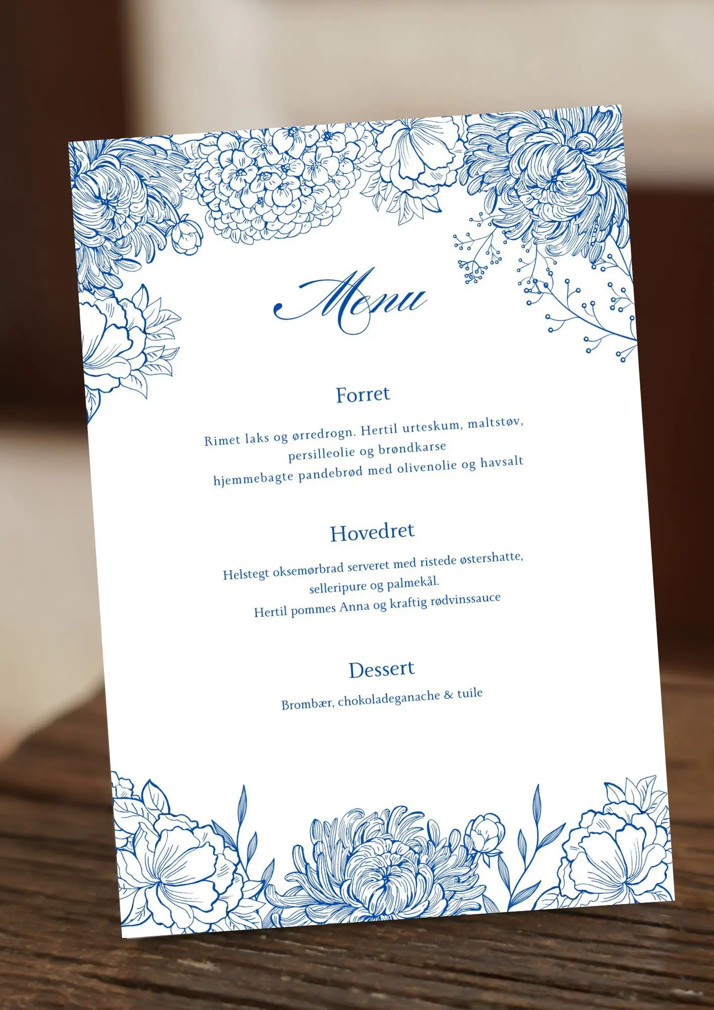 Denne elegante menu er designet i Flora serien, et klassisk og tidløst udtryk med fine blå blomsterillustrationer på hvid baggrund. Designet skaber en rolig og eksklusiv stemning og passer perfekt til bryllup, konfirmation, jubilæum eller andre festlige middage.