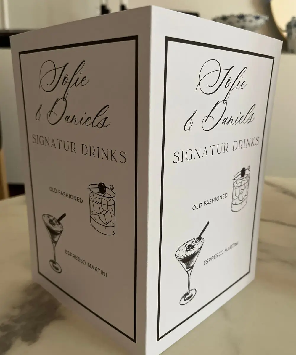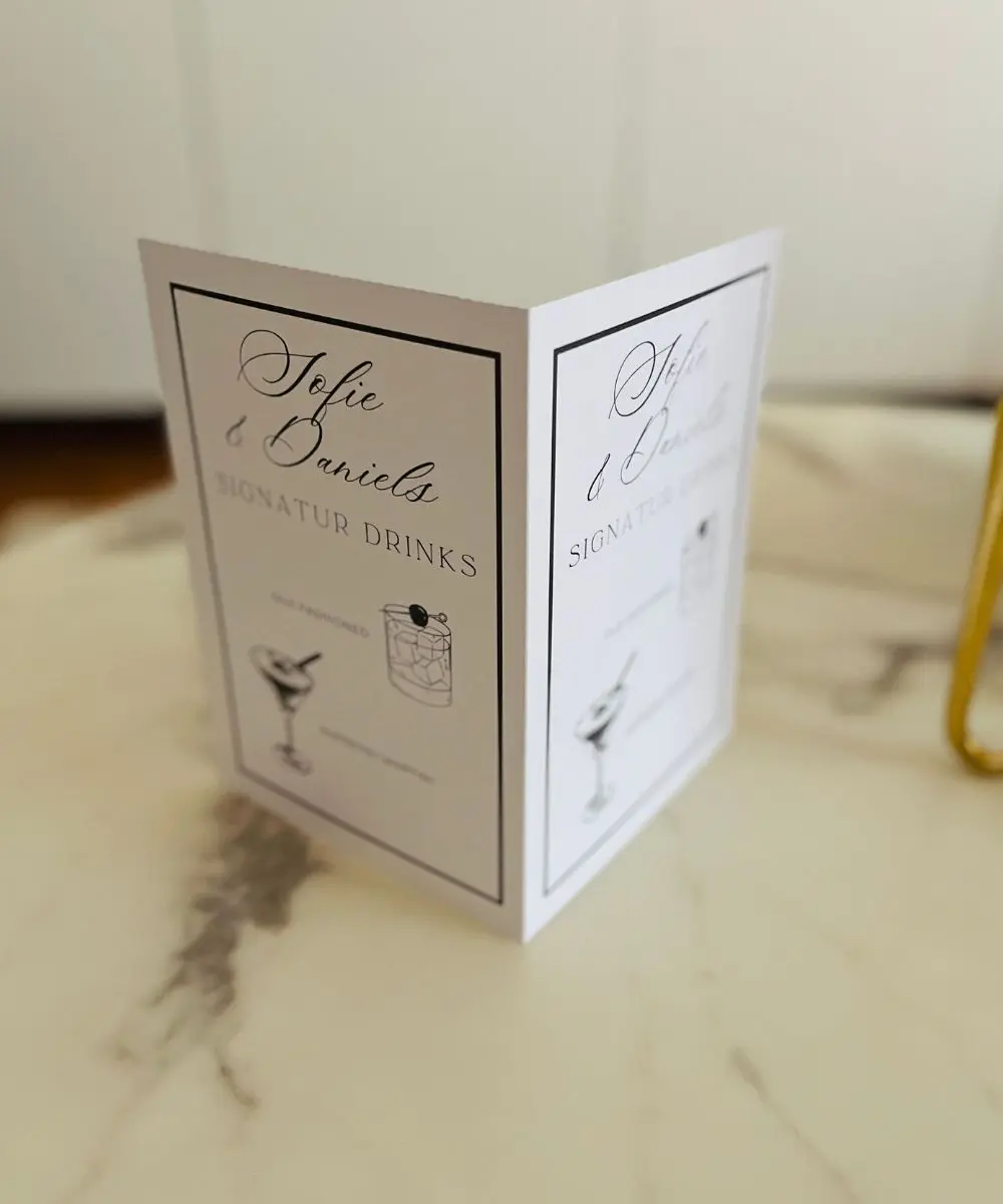 Giv din fest et stilrent og gennemført udtryk med dette personlige drinkskort, designet i et minimalistisk sort/hvid layout med smukke illustrationer af jeres signaturdrinks. Drinkskortet tilpasses med navn(e), overskrift og de drinks, I ønsker – fx Old Fashioned, Espresso Martini eller jeres helt egne favoritter.