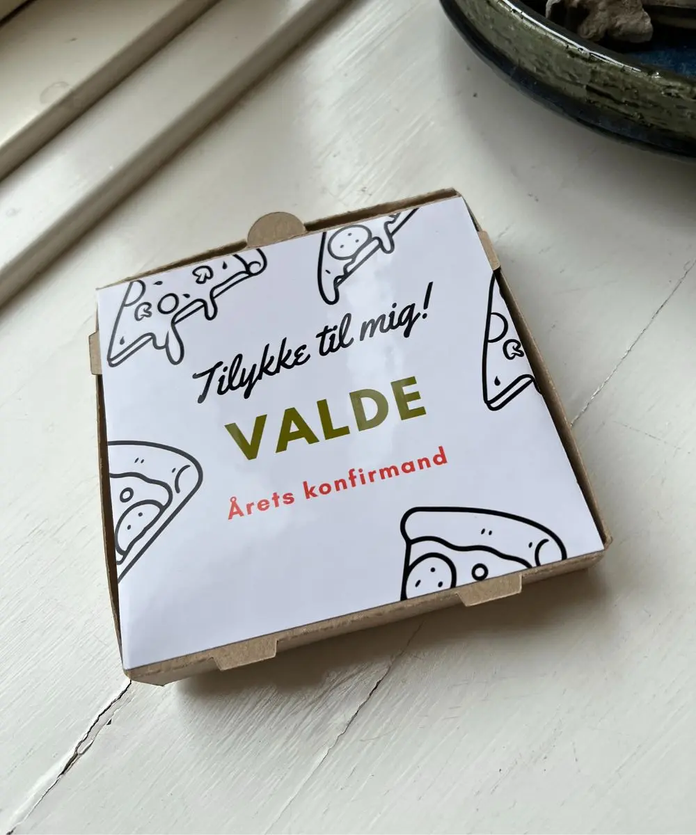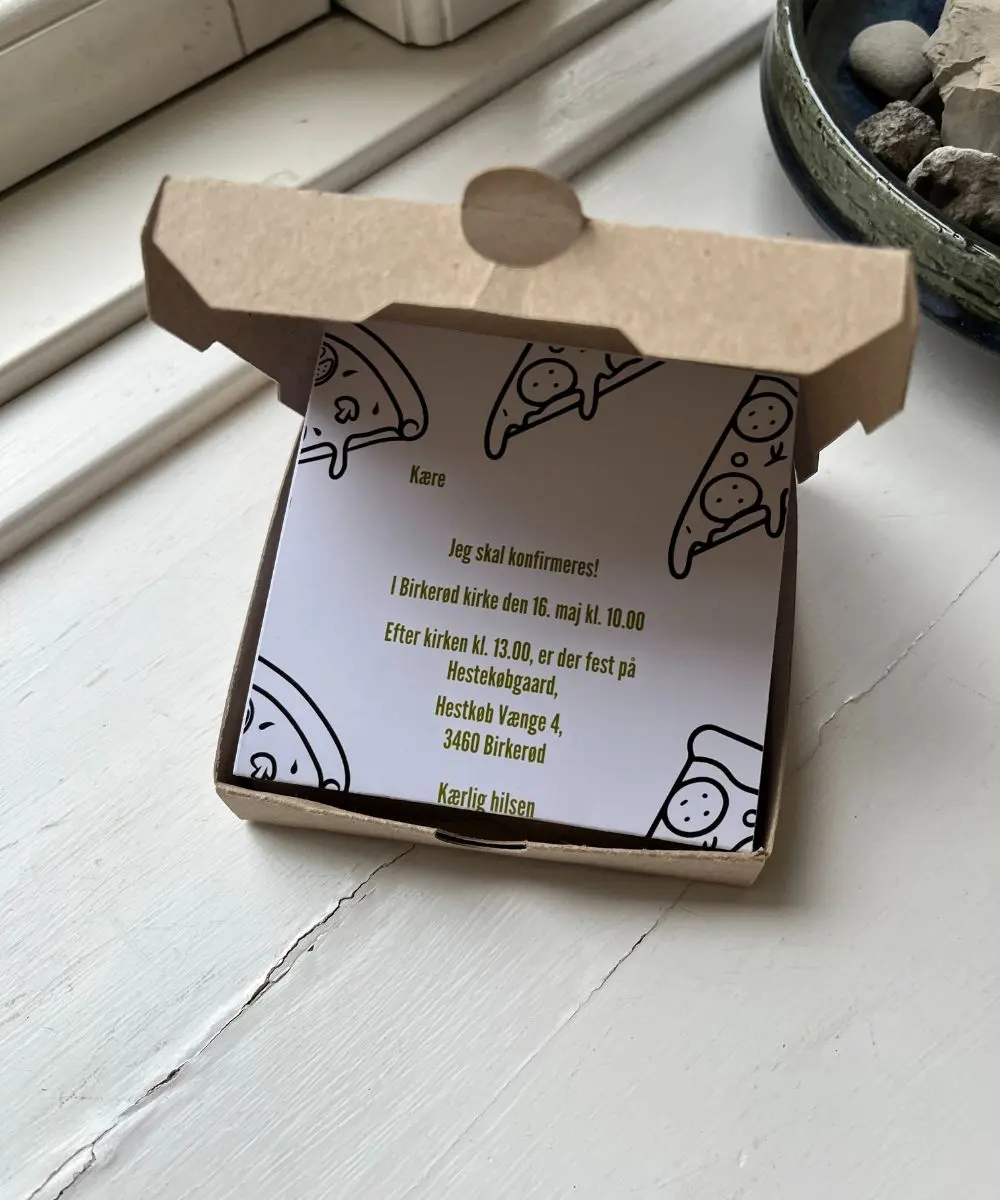 Denne pizza inspirerede konfirmationsinvitation er til konfirmanden, der gerne vil gøre noget anderledes. Invitationen leveres i en ægte mini pizzabakke med et personligt designet indlæg, hvor navn og tekst tilpasses konfirmanden. Udtrykket er humoristisk, moderne og skabt til at overraske modtageren, uden at miste den særlige betydning, en konfirmation eller nonfirmation har.