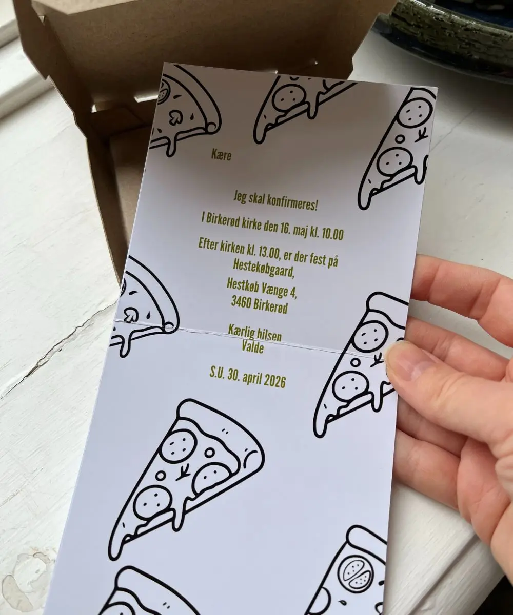 Designet er inspireret af take-away universet, men udført i et gennemført grafisk udtryk, der fungerer som både invitation og minde. Mini pizzabakken åbnes som en klassisk æske og afslører invitationen indeni, hvilket gør den oplagt til konfirmationer/nonfirmationer, hvor gæsterne skal smile allerede ved første øjekast.