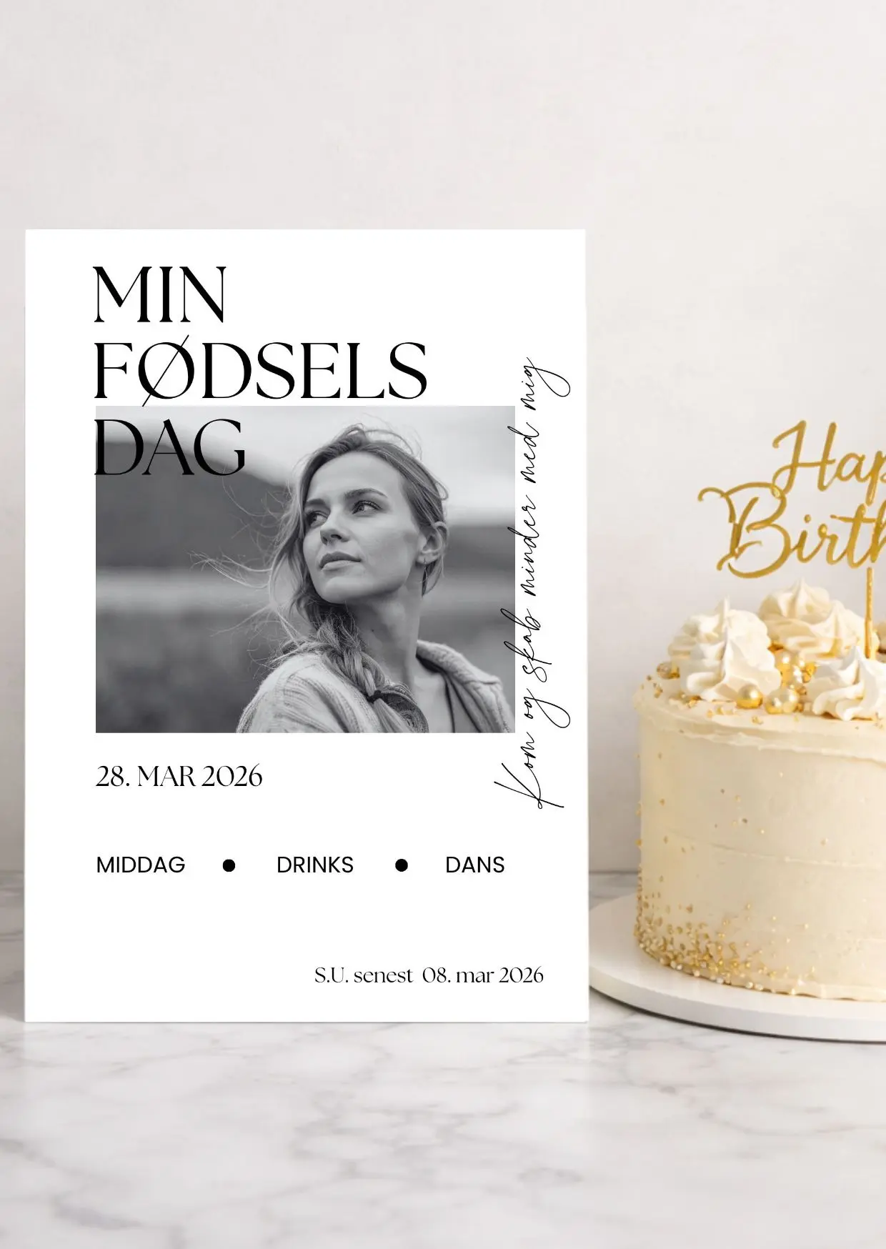 Denne sort-hvide fødselsdagsinvitation er skabt til dig, der ønsker et stilrent og tidløst udtryk. Designet kombinerer minimalistisk æstetik med personlige detaljer, så invitationen føles både eksklusiv og nærværende.